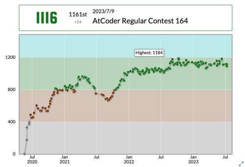 2023/7/9に開催されたAtCoder Regular Contest 164に参加しました。 atcoder.jp 昨日のABCで惨敗を喫してしまい、レートの方はとうとう1100を切るぐらいのところまで落ちてしまいました。 本来なら、昨日の負けを取り戻すべく頑張る、と言いたいところですが…